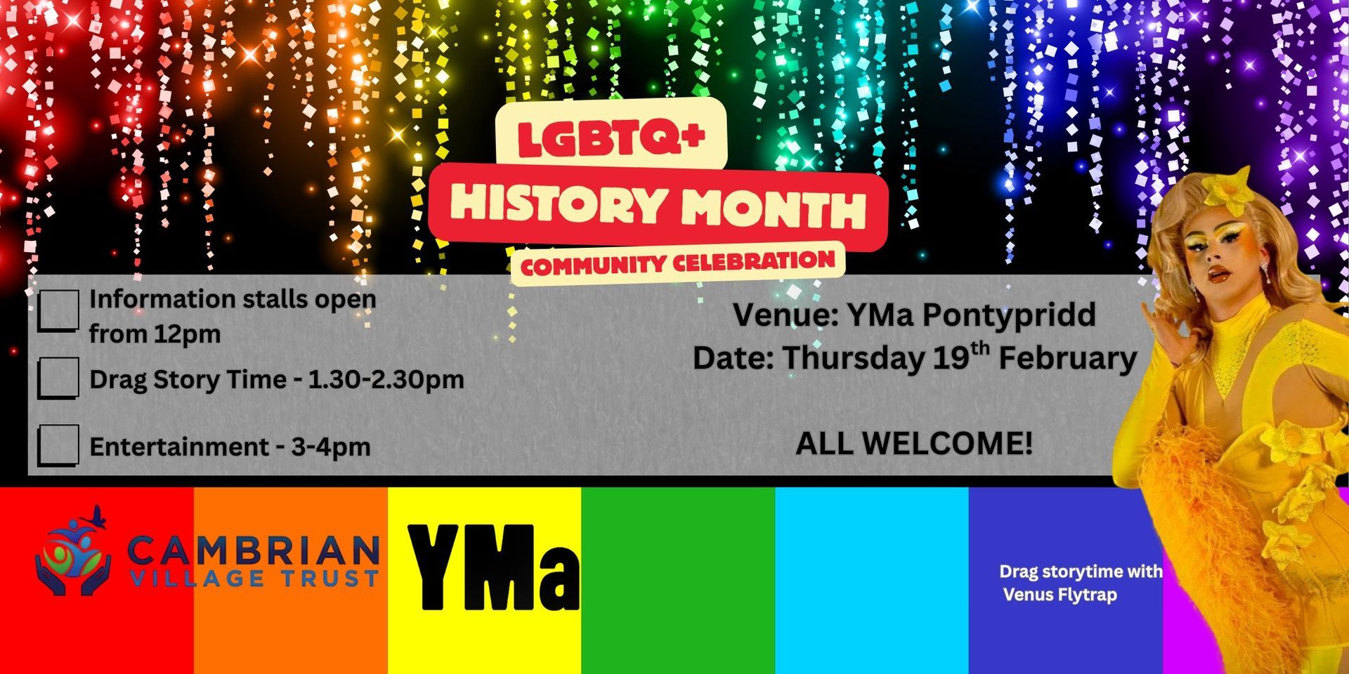 Cambrian Village Trust, in collaboration with YMa Pontypridd, will deliver a free, inclusive community event celebrating LGBTQ+ History Month for communities across the Rhondda and wider Rhondda Cynon Taf (RCT) area. Pontypridd has been selected as a central and accessible location, enabling people from across RCT to attend.